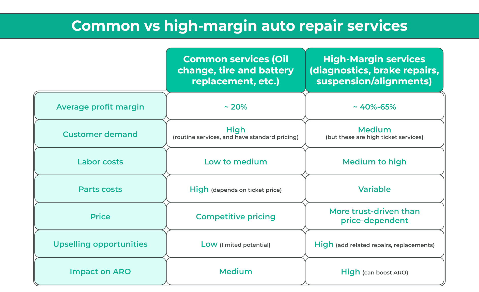 A note on margins: Common services typically run around 20% profit margin. That’s not bad, it’s just the reality of high competition and standardized pricing in these categories. High-margin services, by comparison, run 40–65%. The difference isn’t a small rounding error; it’s the difference between a busy shop and a profitable one.