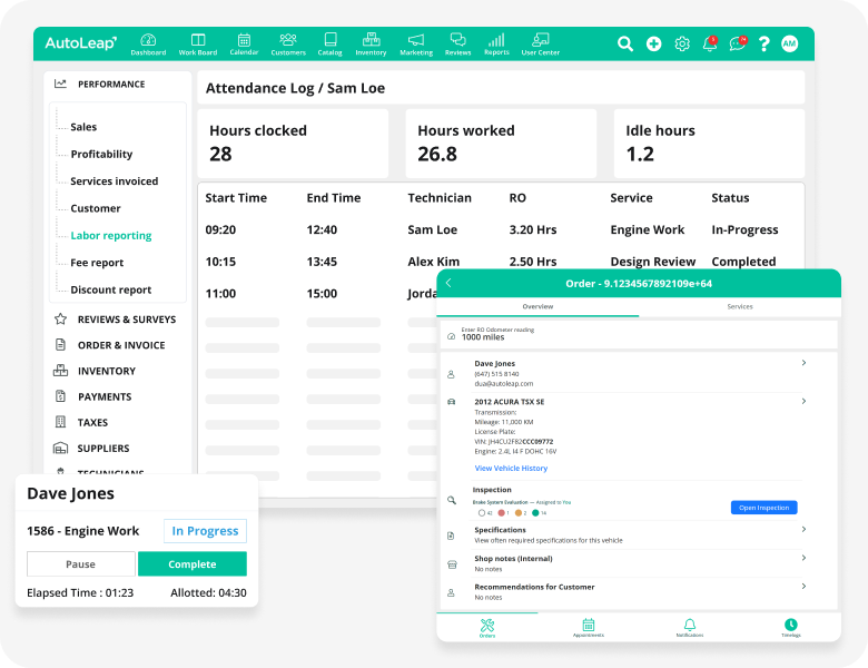 - Track service time logged, technician attendance, and deadlines with our garage software.