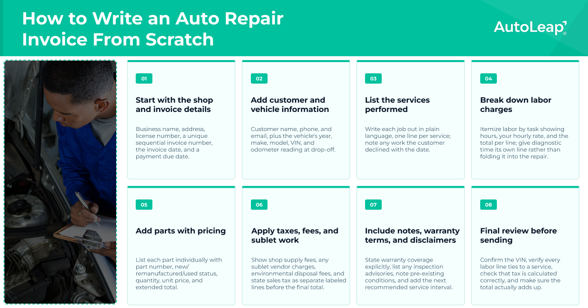 Requirements vary by state, but most jurisdictions require invoices to include your shop’s name, address, and license number; the customer’s name and contact information; the vehicle’s year, make, model, and VIN; an itemized breakdown of parts and labor; and the total charges, including applicable taxes.