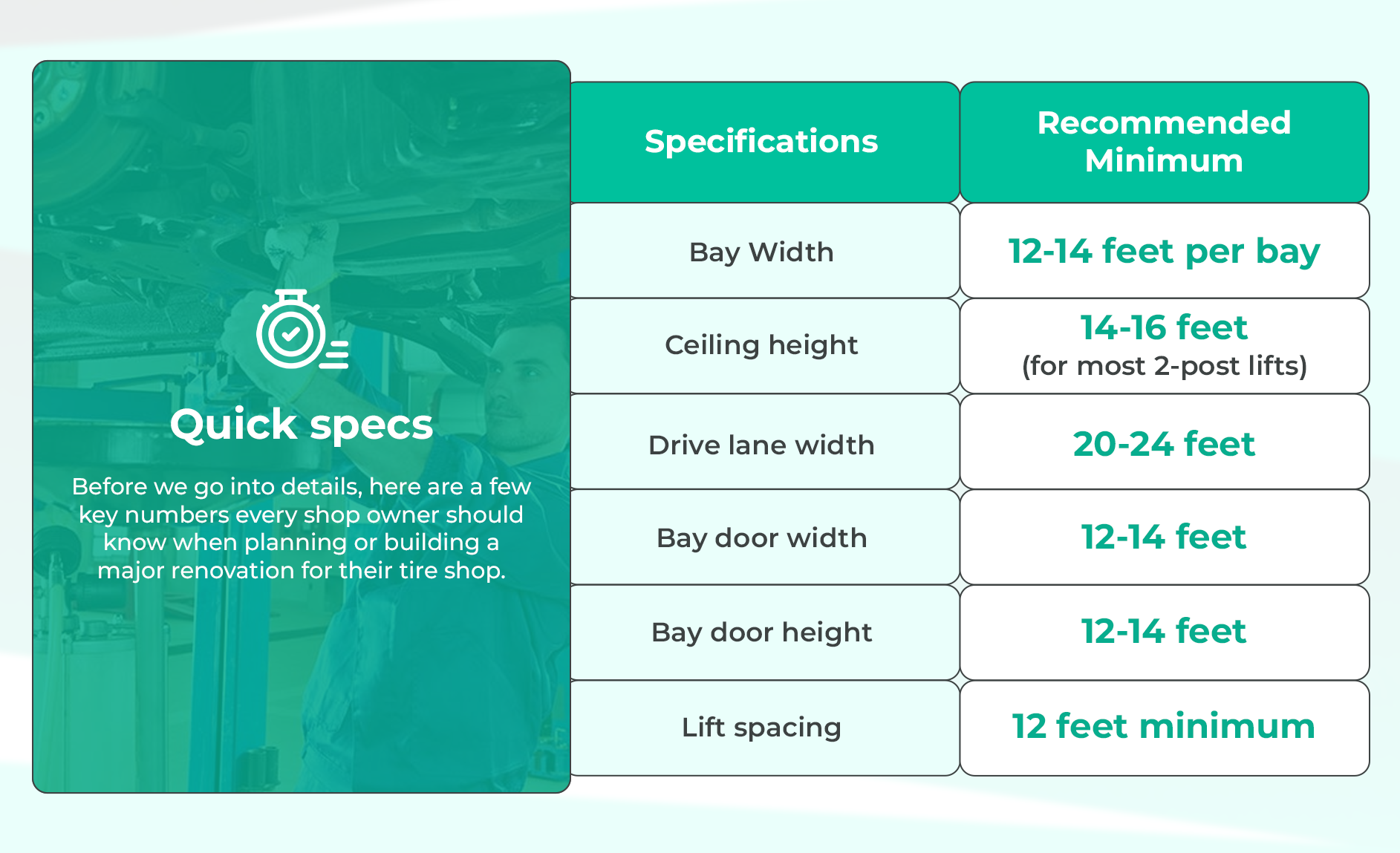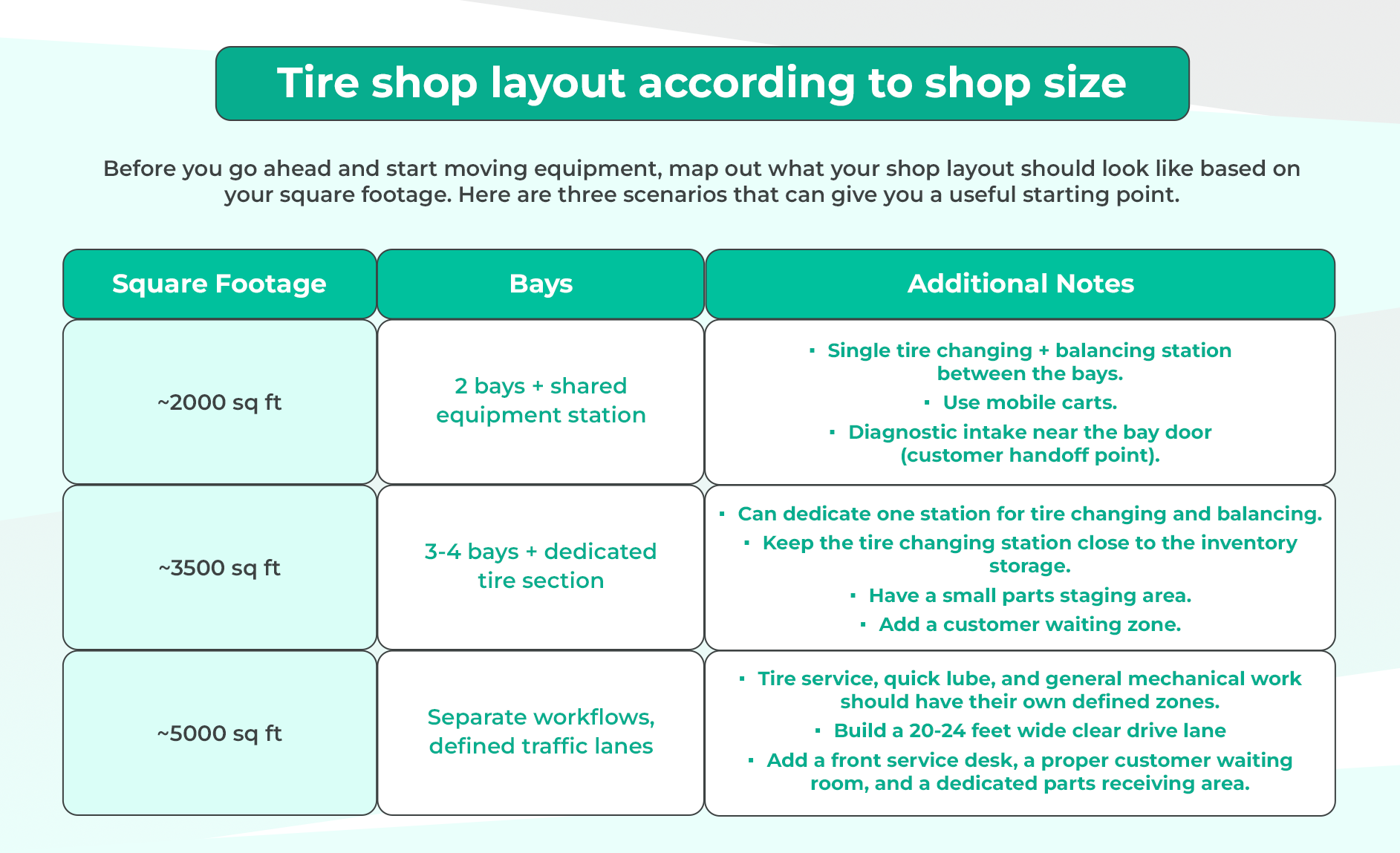 Avoid mixing quick-lube bays with heavy tire repair zones. These are different workflows, and when they share space, both suffer: