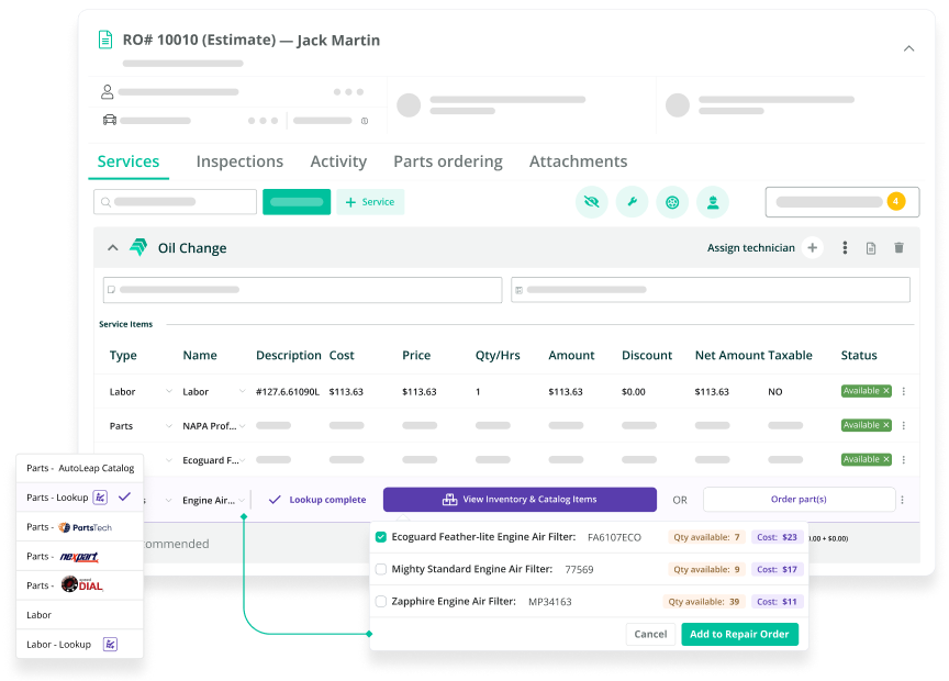 - PartsTech, NextPart, TireHub, RepairLink, and WorldPac for quick and easy parts ordering.