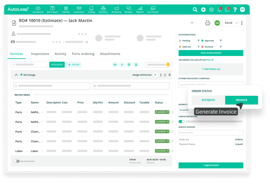 AutoLeap’s auto repair shop invoice software simplifies the billing process, boosting efficiency and accuracy for your auto repair business.