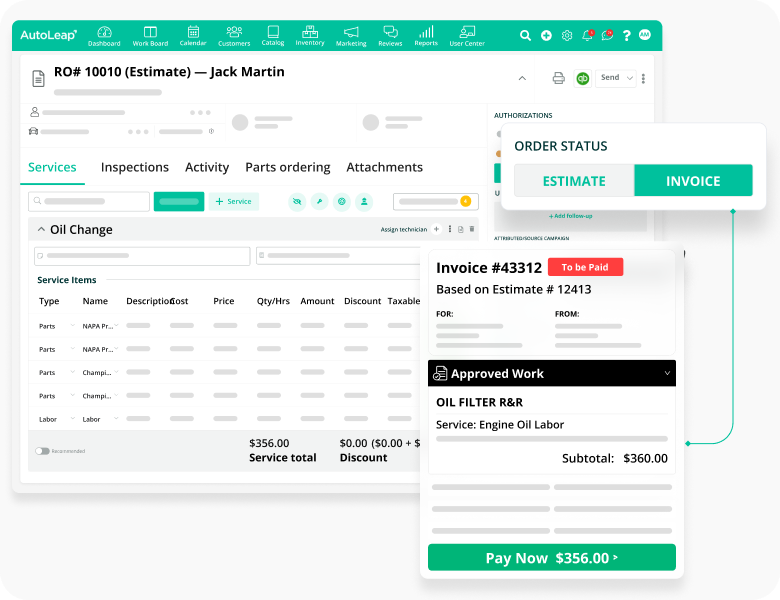 AutoLeap offers reliable features for mobile mechanics to create detailed and accurate digital estimates that customers can approve with their e-signature. The approved estimate will be converted into an invoice with a single-click, which mobile mechanics can then share with the customer directly to their phone via text or email. They can track the status of each pending invoice, and accept payments online or in-person.