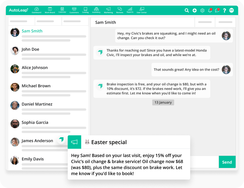 AutoLeap handles reminders, service recommendations and follow-up texts, helping you win repeat business.