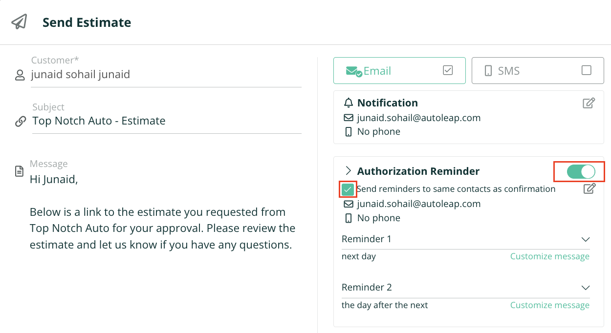 When sending an Estimate to a customer, Authorization Reminders will be turned on by default. This means that if a customer doesn’t authorize the Estimate that day, they will automatically receive a reminder the following day. These reminders ensure customers submit authorization faster so you can get started on the repairs.